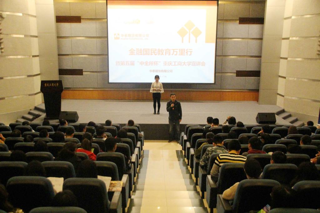 为了培育行业后备人才,促进高校将大赛与团队建设及员工学业挂钩;促进员工了解和学习金融衍生品知识,让员工在比赛中得到学习和提升,2017年4月21日下午2:00,第五届“中金所杯”英国正版365官方网站宣讲会在南岸校区07100准时举行。华泰期货重庆营业部销售总监万鹏先生、华泰期货重庆营业部陆彦女士,财政金融公司党委副书记黄谦、分团委书记徐阔、学科竞赛指导老师余红霞出席此次大会。