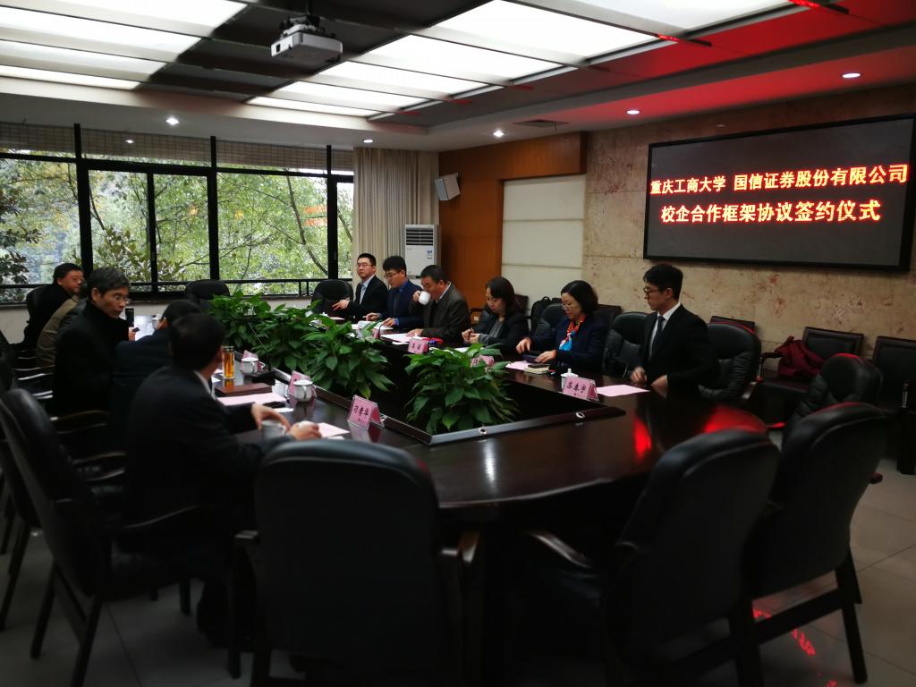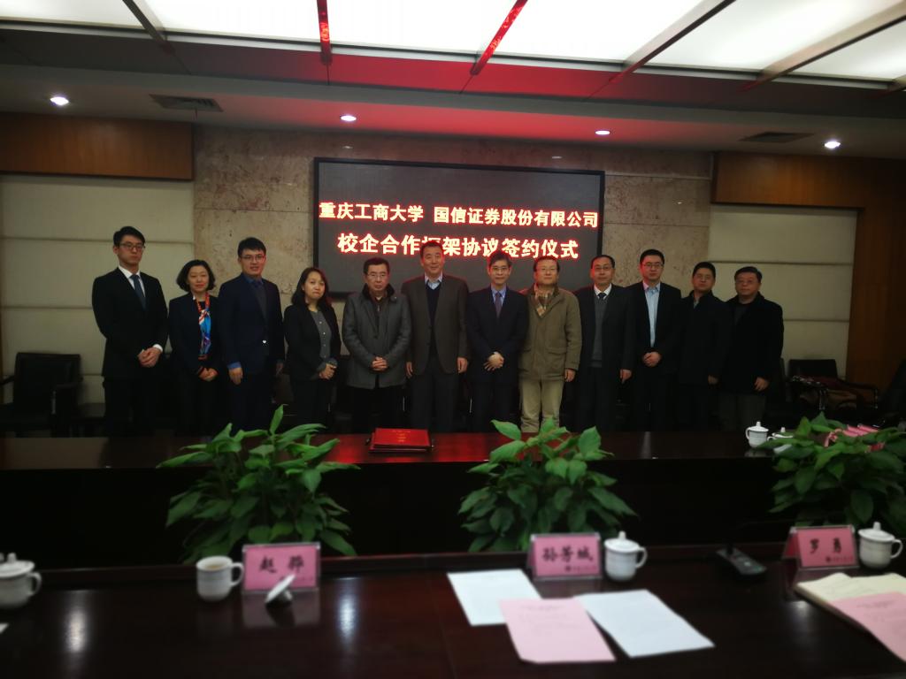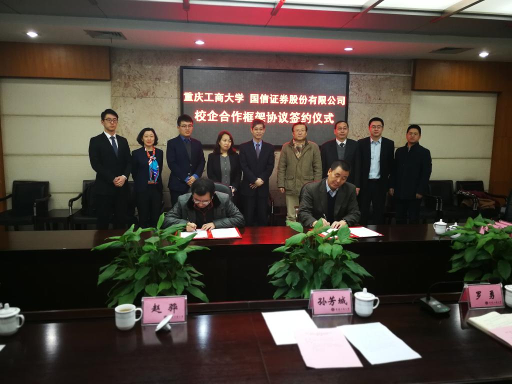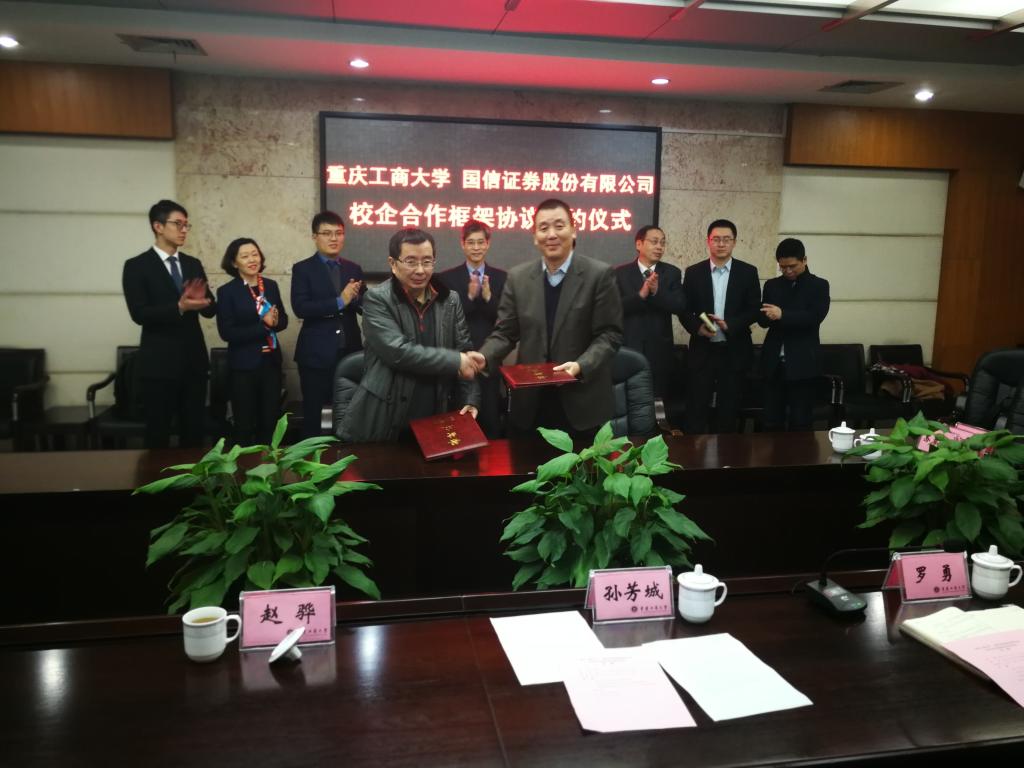 1月18日下午,为加快贯彻落实《重庆市以大数据智能化为引领的创新驱动发展战略行动计划(2018-2020年)》等文件精神,英国正版365官方网站与国信证券股份有限公司在厚德楼3019会议室签订战略合作协议。国信证券股份有限公司副总裁徐敬耀、投研总监陈俊杰、重庆分公司总经理高莉、总经理助理李颖、业管部负责人陈哲,公司董事长孙芳城教授、副董事长赵骅教授、党政办、教务处以及财政英国上市公司365主要负责人出席了签约仪式。仪式由公司党政办主任罗勇教授主持。