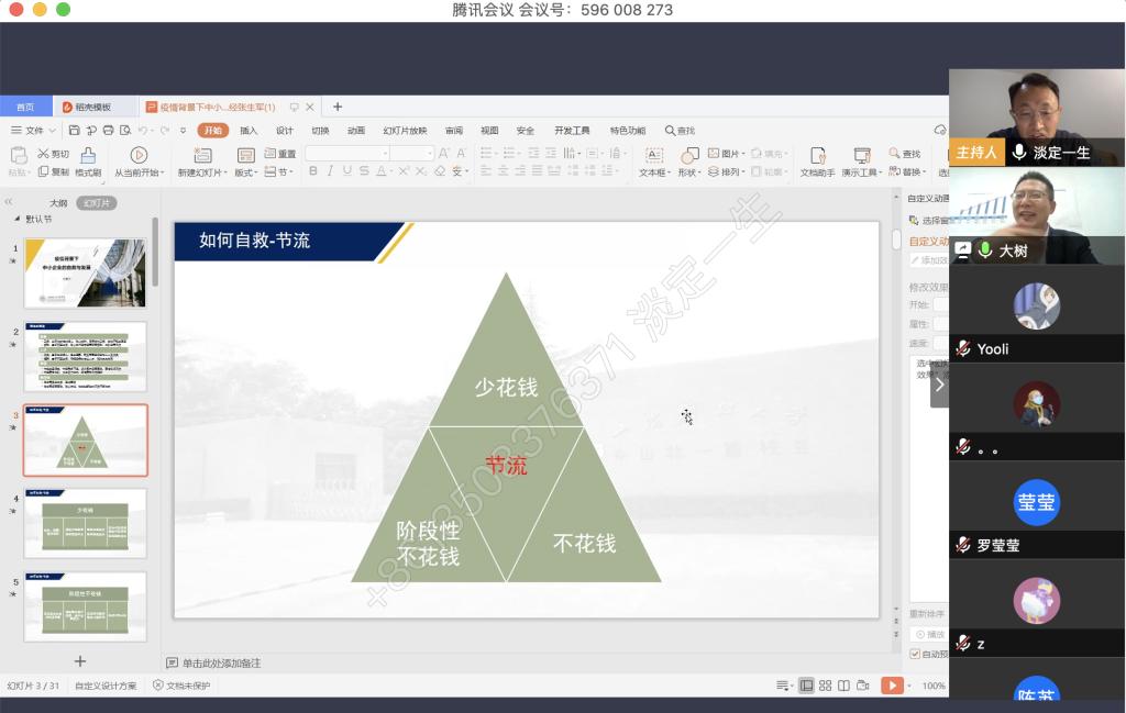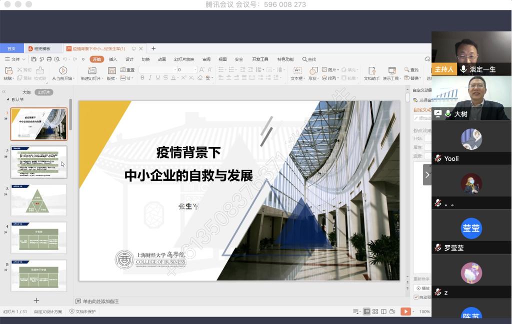 4月9日晚上,公司税务硕士教育中心通过腾讯会议成功举办了本年度第一次南山税务沙龙——疫情背景下中小企业的自救与发展。本次沙龙由英国正版365官方网站尚可文教授主持,特邀请迅驰车业江苏有限公司副总裁、上海财经大学硕士生导师张生军博士主讲,公司2019级税务硕士研究生参加了沙龙。