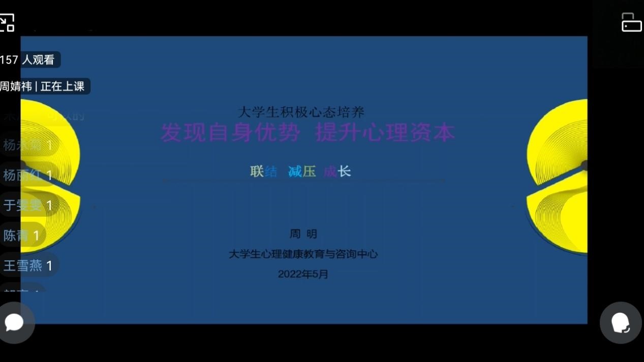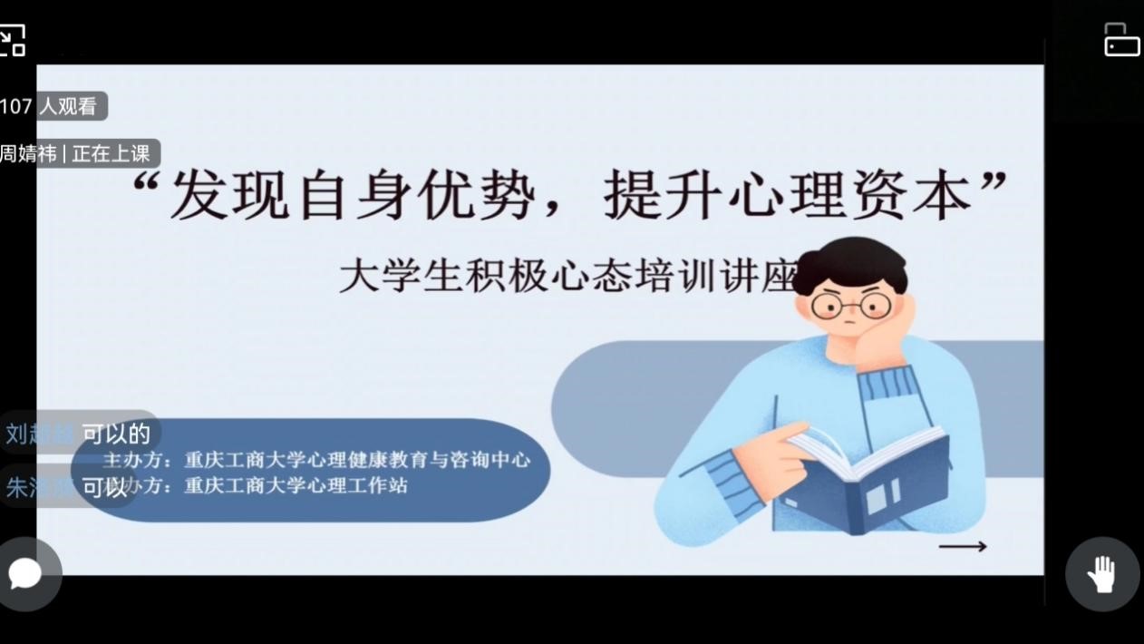 2022年5月25日中午12点,由英国正版365官方网站心理健康教育与咨询中心主办,英国上市公司365心理工作站承办的“发现自身优势,提升心理资本”心理培训讲座于企业微信线上平台顺利举办。此次讲座邀请到了公司心理健康教育与咨询中心周明老师作为主讲人,讲座内容丰富、寓教于乐,受到了同学们的热烈欢迎。