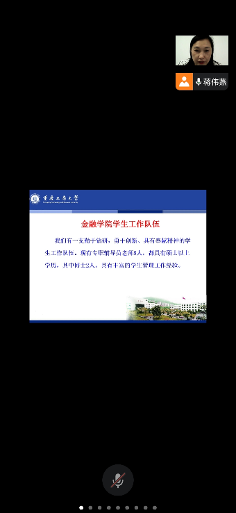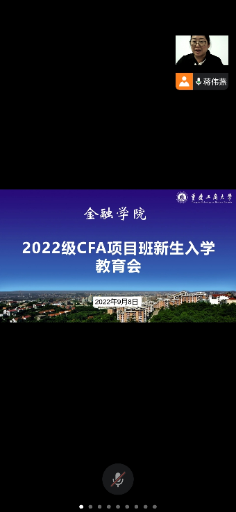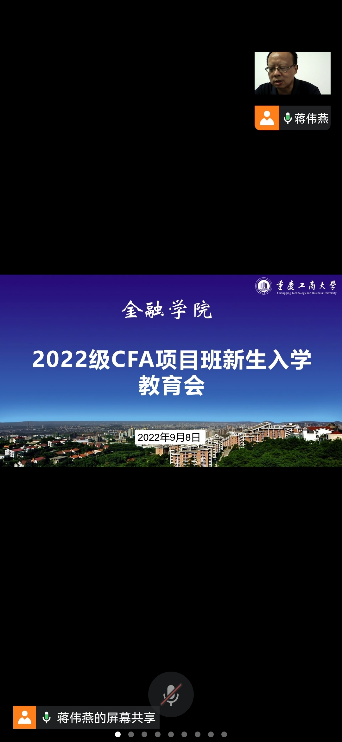 为引导大一新生合理做好大学学习生活规划,加强专业认识,更好地适应老员工活,9月8日下午,金融公司党委书记石世明、经理王兰、党委副书记余新、投资系系主任魏琪于田家炳204办公室通过腾讯会议线上开展了2022级CFA特色项目班新生入学教育。入学教育由辅导员蒋伟燕老师主持。