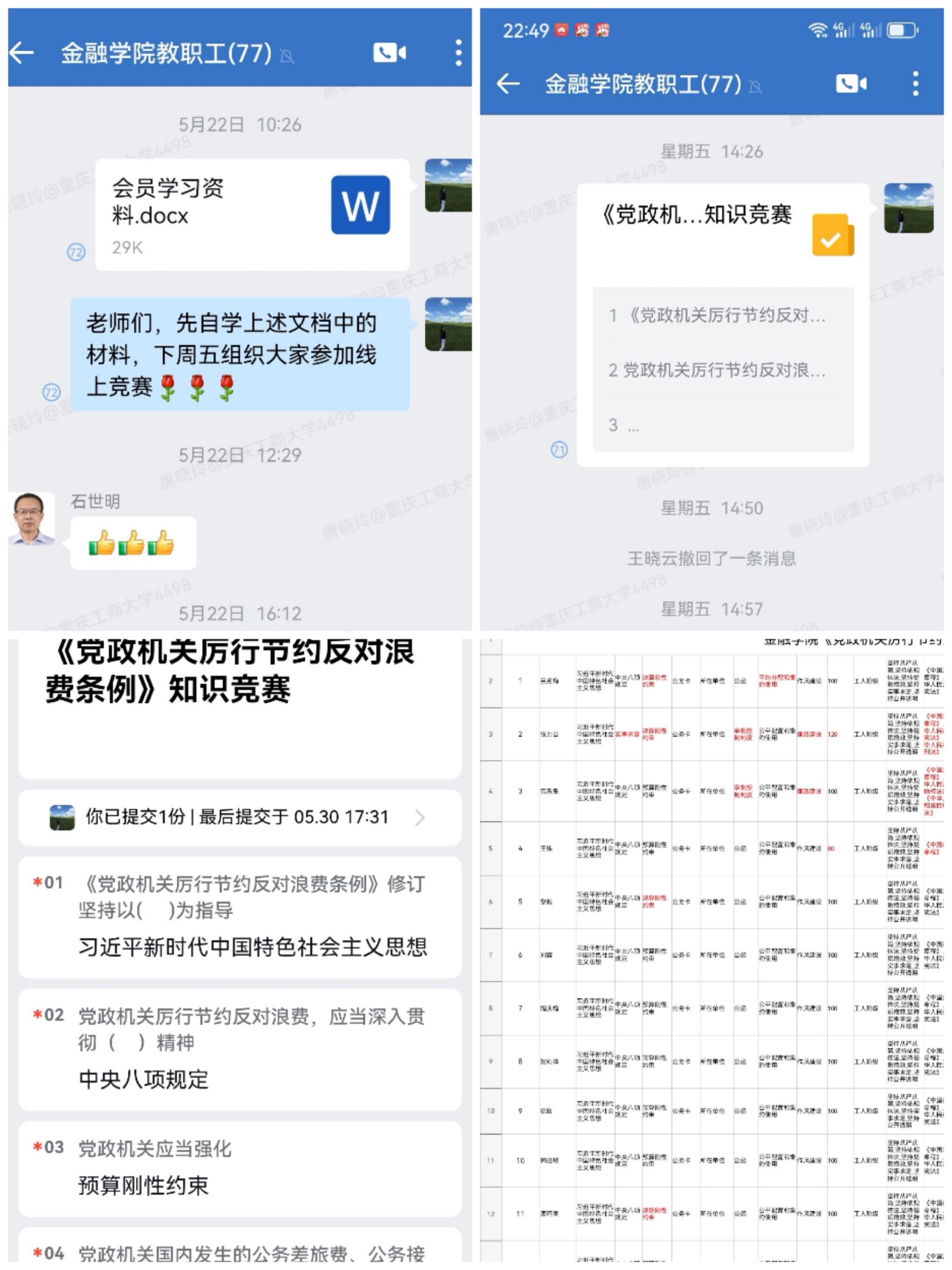 公司工会先将《党政机关厉行节约反对浪费条例》放在部门企业微信群,要求会员们自学;5月30日,工会主席领学条例的主要内容;随后开展在线答题。本次竞赛共有25个题目,其中单项选择题和判断题各10题,多项选择5个题;题目主要结合高校教师的实际,选择了经费管理、国内差旅、公务接待、资源节约等相关内容。会员们认真学习条例,仔细作答竞赛题目,获得满分的会员达到20人。