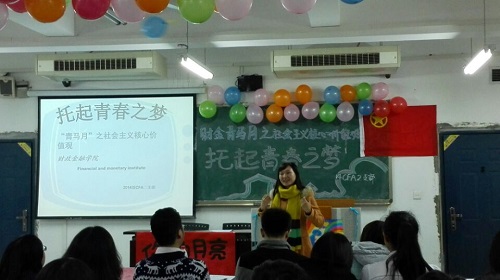 最后,财金公司分团委书记兰丽娟老师对此次团日活动做了点评,她给予此次团日活动很高的评价。她充分肯定了CFA2班全体成员都非常认真努力准备并参与这次团日活动的积极向上的精神。同时,她也鼓励同学们勇敢地“托起自己的青春之梦”,努力勇敢地去追求自己梦想。