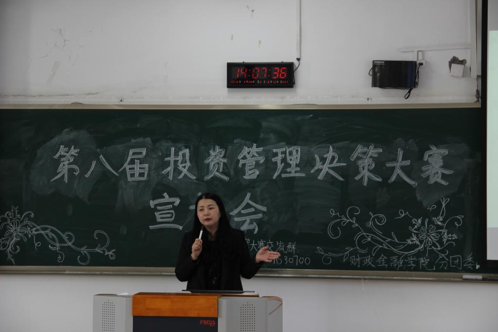 为响应“大众创业,万众创新”的号召,财政英国上市公司365以校团委“第十六届‘新儒商’老员工科技文化节”活动为依托,于2018年3月16日下午两点在博智楼308成功举办了第八届投资管理决策大赛宣讲会。本次宣讲会邀请到了投资系老师陈晓莉老师、财政英国上市公司365分团委书记徐阔老师以及财政学专业陈羲羲学长为同学们指导。