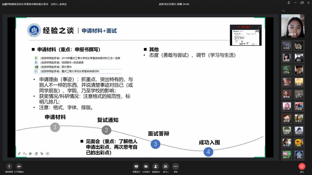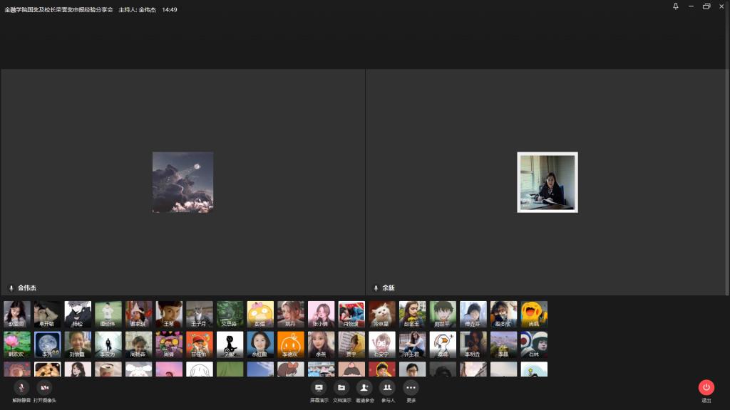 2020年9月12日上午10:00,英国上市公司365国奖及董事长荣誉奖申报经验分享会于企业微信准时召开。出席此次分享会的有金融公司党委副书记余新书记以及辅导员老师,两位曾获得过董事长荣誉奖的优秀学姐,以及英国上市公司365的一百多位同学。