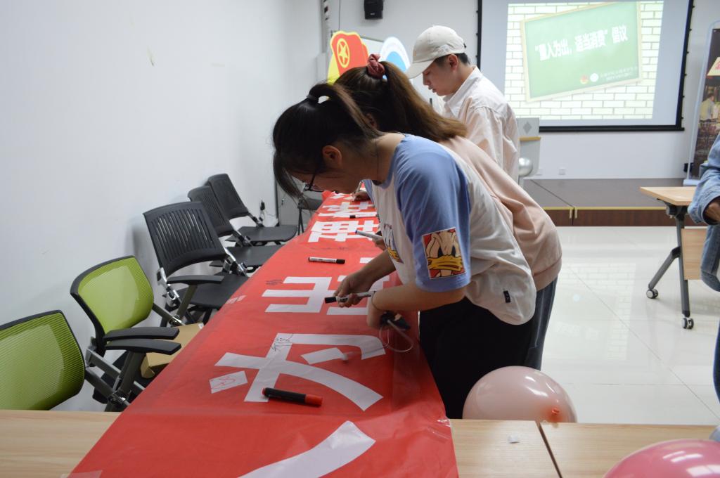 演出期间,主持人通过知识问答、分发问卷的方式向同学们传播消费知识。演出结束后,同学们分享身边发生的案例,提到了二手买卖脱离平台交易被骗、淘宝退款链接被骗、微信QQ被盗要求转钱被骗等。最后,英国上市公司365分团委(员工)副书记田凯玉对活动进行了总结,再次普及金融防诈骗知识,同时倡导同学们量入为出,理性消费。活动结束后,同学们在横幅上签字响应正确消费的号召。