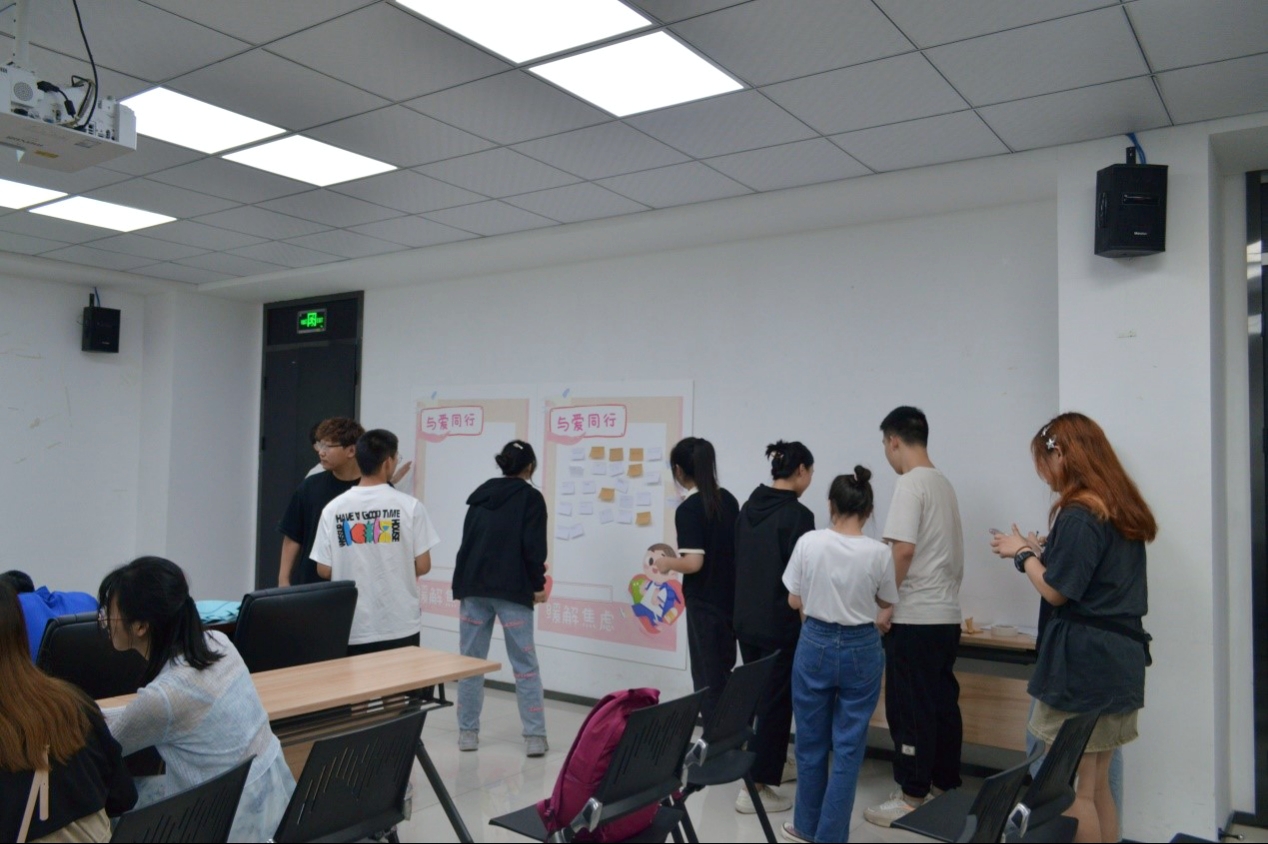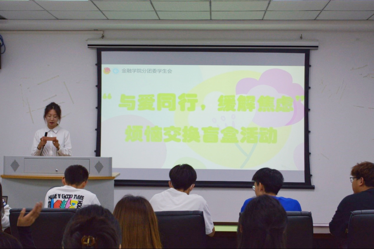 随后,主持人介绍了烦恼交换盲盒活动的具体规则,并邀请同学们在便签上写下自己的焦虑或者烦恼贴在展板上,同时写下一句鼓励的话语或者座右铭放入盲盒中。完成后,参与活动的同学将在在盲盒里随机抽取一张鼓励话语并将抽取的话语写在自己认为符合的展板上的一张烦恼便签上,寓意着用鼓励代替烦恼,以希望解决忧愁。同学们参与积极度高,收获颇多。有同学谈到:“大学后,每天都会有烦恼,周边内卷的同学很多,我们每个人都要心平气和,与自己和现实和解;思考清楚理想的生活状态,人生没有绝对的模板,只有适合自身的选择。”