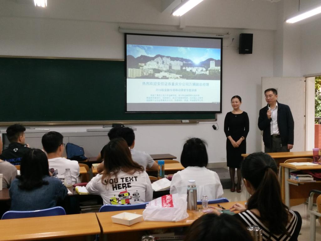 2017年4月24日上午,英国正版365官方网站2016级金融硕士《金融机构经营管理》移动课堂“走进”田家炳311教室。出席本次讲座的领导有财政英国上市公司365副经理曾胜、金融系教授骆志芳、安信证券重庆分公司副总经理万娟及其助理易丽娟。讲座一开始由财金公司副经理曾胜致欢迎词。