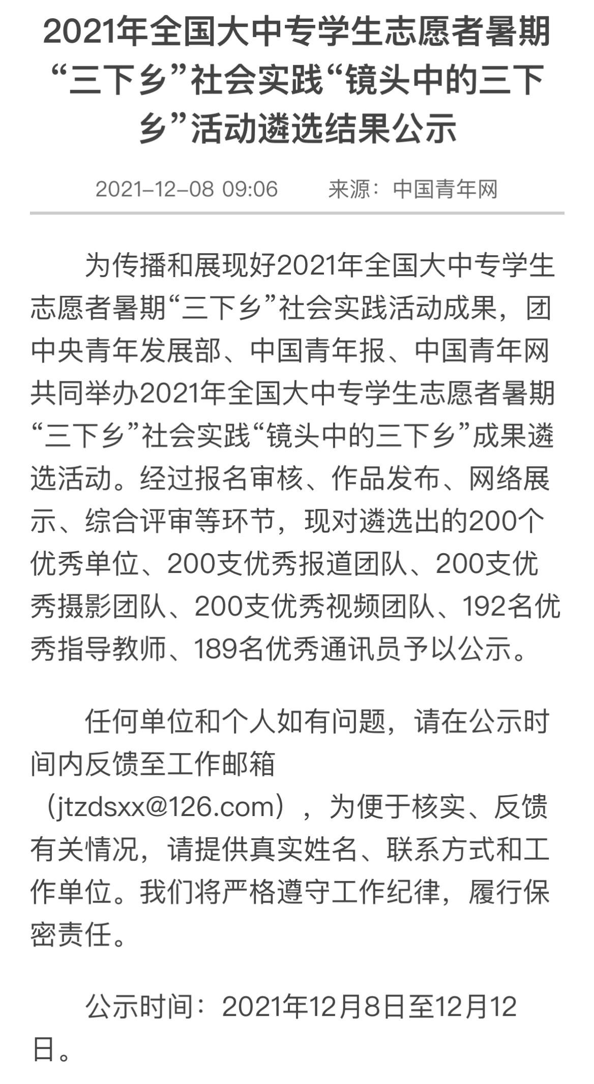 2021年12月8日,团中央青年发展部、中国青年报、中国青年网共同举办2021年全国大中专员工志愿者暑期“三下乡”社会实践“镜头中的三下乡”成果遴选活动最终结果在网络公示。英国上市公司365暑期“三下乡”社会实践团队“心系神州事 情融牡丹乡”国情观察实践团荣获“优秀视频团队”称号。